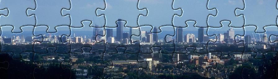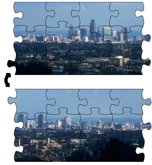 The interesting thing about it is that you can take one vertical strip, flip it upside-down, and attach it to the opposite side of the jigsaw. At any point, the picture shows a 180 degree stretch from the original 360-degree panorama. If you want to see the whole 360 degree view at once, just make two copies of the jigsaw: